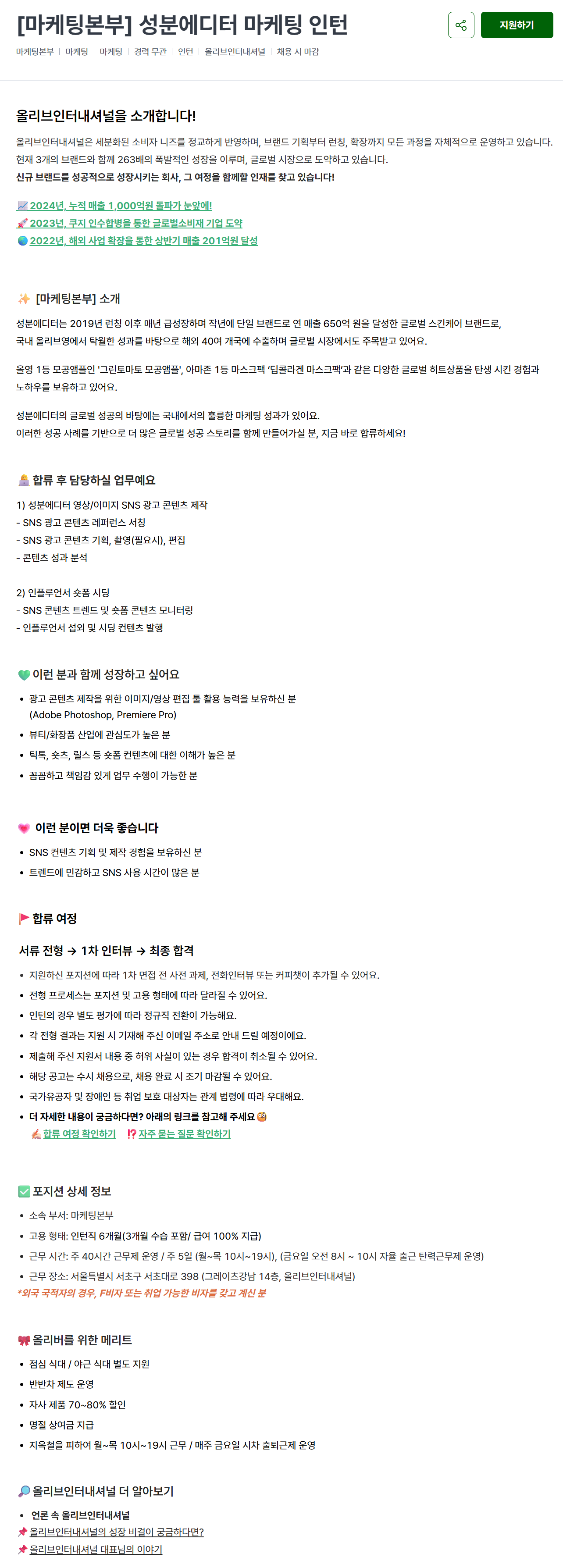 [올리브인터내셔널] [마케팅본부] 성분에디터 마케팅 인턴