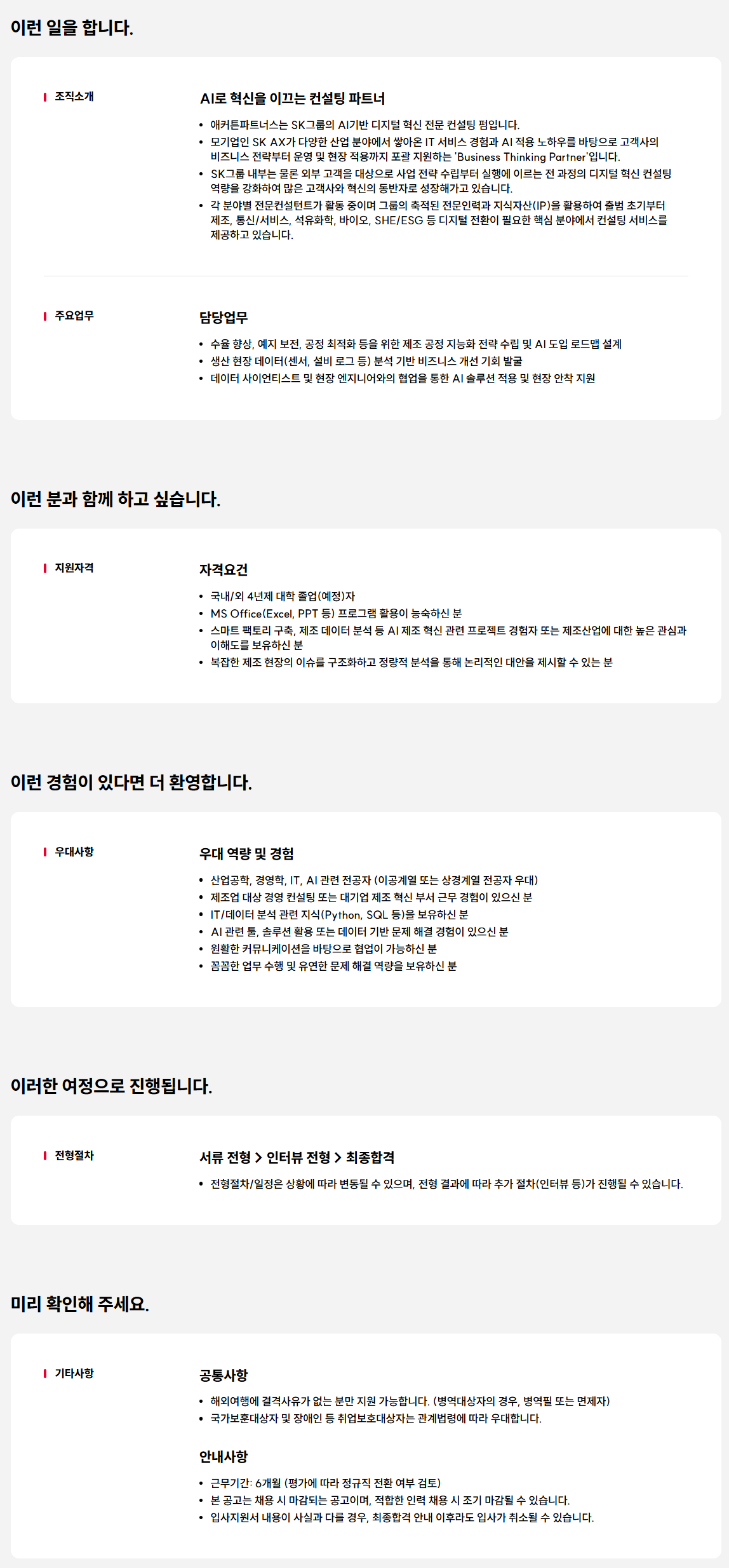- 스마트 팩토리 구축, 제조 데이터 분석 등 AI 제조 혁신 관련 프로젝트 경험자 또는 제조산업에 대한 높은 관심과 이해도를 보유하신 분