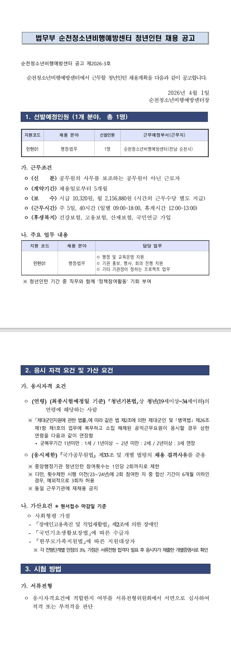 [순천청소년비행예방센터] 2026년 제1회 법무부 순천청소년비행예방센터 청년인턴 채용 재공고