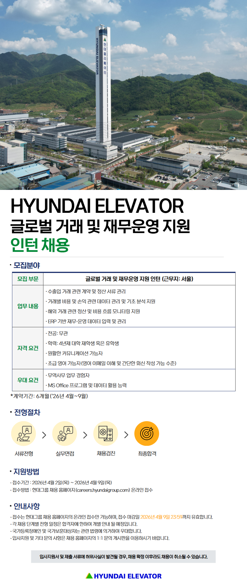 [현대엘리베이터] 글로벌 거래 및 재무운영 지원 인턴 채용