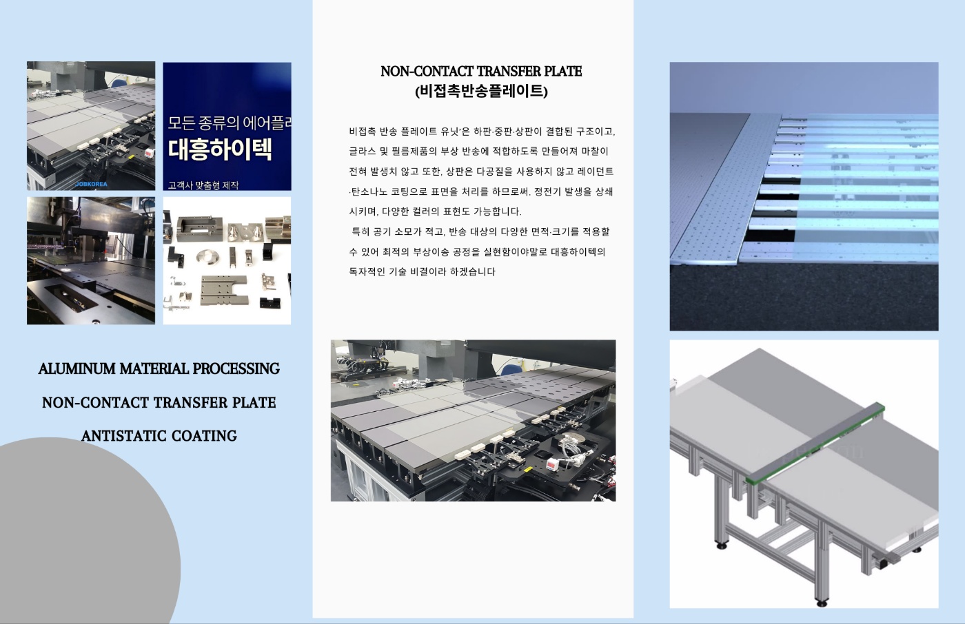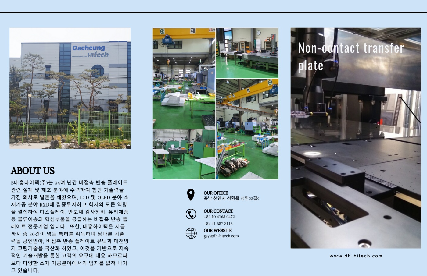대흥하이텍(주)는 1991년 설립 아래 30여 년간 비접촉 반송 플레이트 관련 설계 및 제조 분야에 주력하여 첨단 기술력을 가진 회사로 발돋음 해왔으며, LCD 및 OLED 분야 소재가공 분야 R&D에 집중투자하고 회사의 모든 역량을 결집하여 디스플레이, 반도체 검사장비, 유리제품 등 물류이송의 핵심부품을 공급하는 비접촉 반송 플레이트 전문기업 입니다 . 또한, 대흥하이텍은 지금까지 총 30건이 넘는 특허를 획득하며 남다른 기술력을 공인받아, 비접촉 반송 플레이트 유닛과 대전방지 코팅기술을 국산화 하였고. 이것을 기반으로 지속적인 기술개발을 통한 고객의 요구에 대응 하므로써 보다 다양한 소재 가공분야에서의 입지를 넗혀 나가고 있습니다.