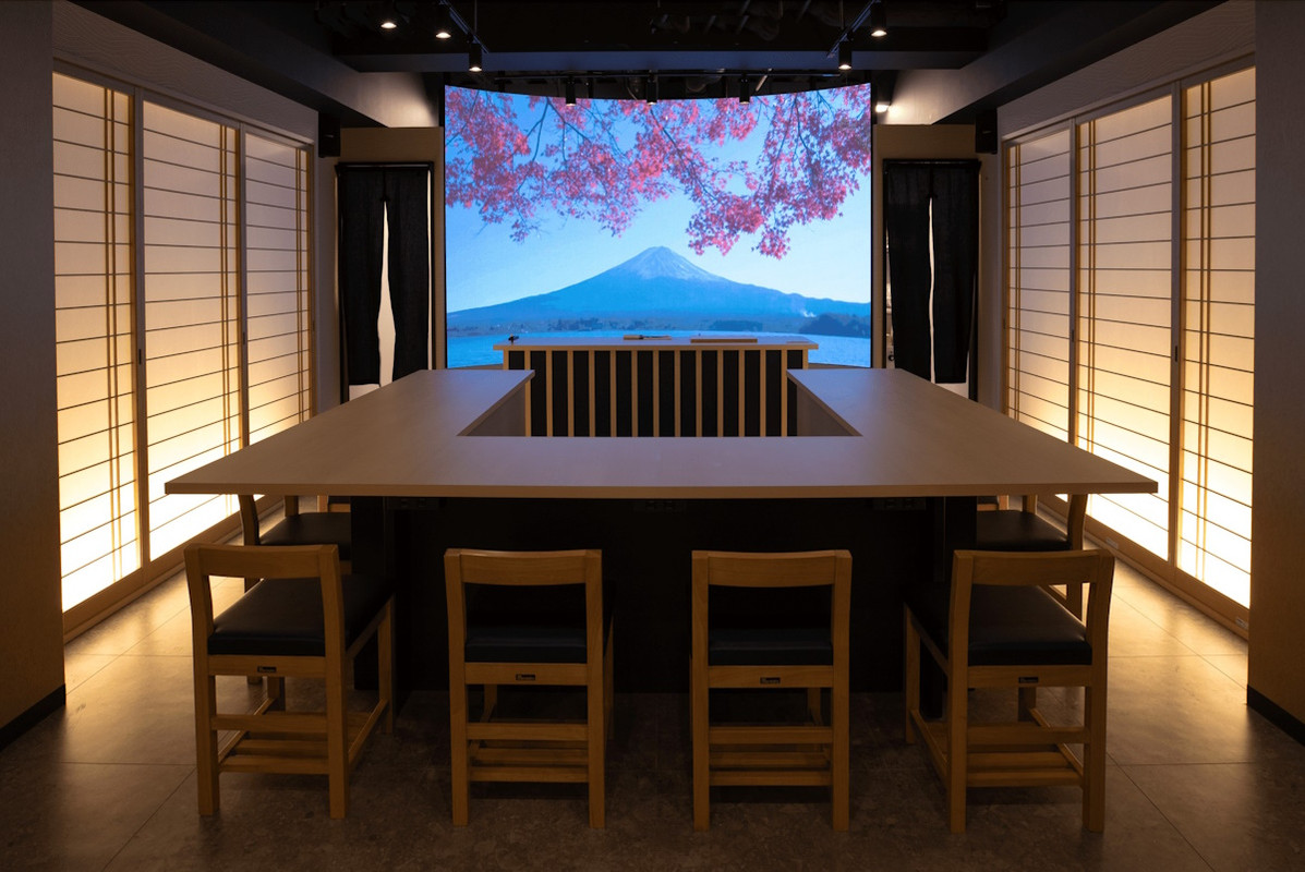 점내 에 설치 되여 압도적 현장감을 느낄 수 있는 초대형 곡선 스크린에는 일본 문화나 스시역사 등이 나와 2시간에 걸친 체험을 통하여 엔터테인먼트 성 넘치는 몰입 형 일본 체험을 즐길 수 있습니다.