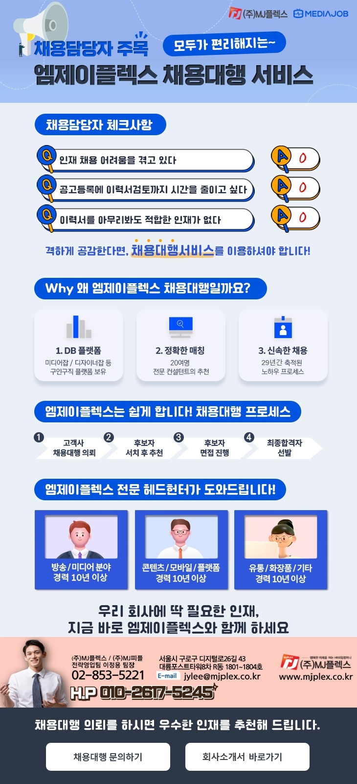 ㈜MJ피플은 2000년, 온라인 리크루팅 서비스를 기반으로 설립된 이래, 전문 취업포털인 미디어잡, 디자이너잡, 돌보미닷컴을 통해 업계 선도적인 채용 플랫폼으로 자리매김해왔습니다.