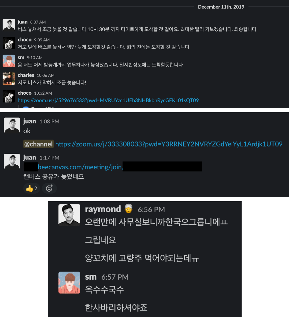 하지만 서로 대면하여 대화할 일이 전혀 없는 상황에서 Slack으로 하는 'Text-Based Communication'은 굉장히 불필요한 요소들을 자아낸다. 애초에 서로 상황을 정확하게 이해를 못하고 있는데, 텍스트로 대화를 하면 대화 중 '이거 말씀하시는건가요?' '그런 부분도 있겠지만, 제 말은 그게 아니고~' 등의 상대방을 배려하기 위한 본론 꾸밈말들을 텍스트로 치다보면 정말 한 시간씩 뚝뚝 지난다.