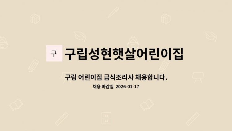 구립성현어린이집에서는 조리사를 다음과 같이 모집합니다. □ 모집직종 : 조리사 1명(조리사자격증 소지 필수) □ 직무내용 : 어린이집 급간식 조리 및 조리실 위생 관리 □ 근무조건 : 09:00~17:30(주5일 근무) □ 급여조건 : 2022년 보육사업지침 조리사 인건비지급기준 준용/처우개선비,위생수당 별도 지급 □ 접수방법 : 이메일([email protected])접수, 팩스 □ 제출서류 : 이력서, 자기소개서, 자격증사본, 경력증명서(경력자에 한함) □ 전형절차 : 1차 서류전형 후 2차 면접자는 개별통보 □ 교통편 : 지하철 2호선 서울대입구역에서 도보 10분 / 버스 탑승시 2정거장 이동 ※ 시설현황 : 원아 60명(정원75명), 교직원 13명