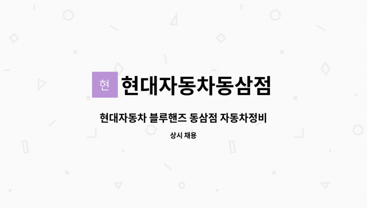 현대자동차 블루핸즈 동삼점 자동차 보증 수리 및 일반 수리 업무 (경력) 현대자동차 지정정비업체, 운전필수(1종보통 필수)/ 군필자 우대 *지원방법: 전화연락 후 이력서 지참하여 방문요망