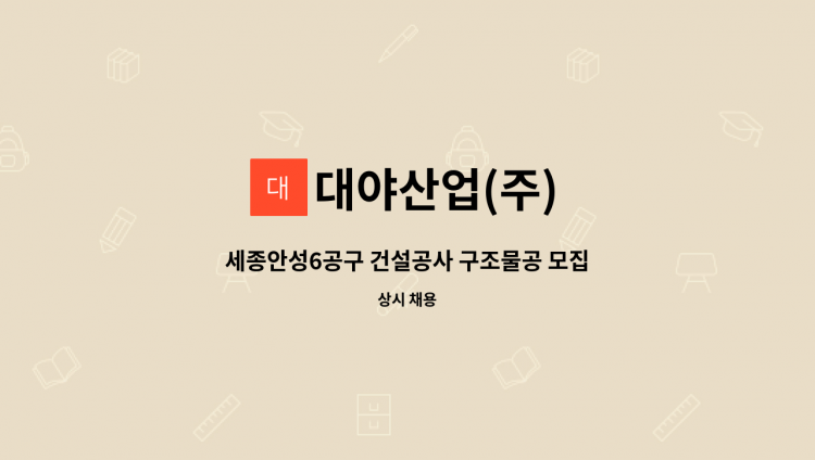 평택 P3 인프라 구조물 및 토목공사 현장 1. 구인분야 : 안전관리자 2. 업무내용 : - 현장서류관리 1명(3년이상 / 경력자 우대) 3. 구인기간 : 채용시까지 4. 고용형태 : 정규직 5. 임금사항 : - 현장관리(경력에 따라 차등지급) 6. 공사기간 : ~ 2023년 12월 30일(이후 연계 가능) 6. 우대사항 : 산업안전/건설안전(산업)기사자격증 7. 기숙사 제공여부 : 출퇴근 및 숙소 가능 8. 우대사항 - 경력자 우대 9. 지원방법 : 전화, 이메일 10. 필요서류 : 이력서 11. 근무조건 : 격주5일 근무(휴일 - 월 6일) 12. 업체명 : 대야산업(주) 13. 현장근무지 : 삼성전자 평택 P3- 인프라 현장 14. 4대보험(국민연금, 고용보험, 산재보험, 건강보험) 적용여부 : 적용 15. 담당자 - 성 명 : 이택형 과장 - 이메일 : [email protected] - 담당자연락처 : 010-****-**** (*개인정보가 자동 블라인드 됩니다.)