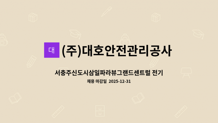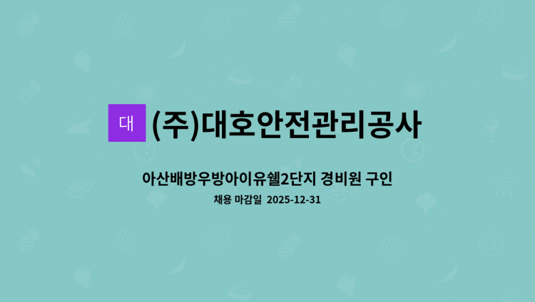 현장명: 순천금호어울림더파크(459세대,6개동) 모집부문 : 경리주임 모집인원 : 1명 급여 : 2,200,000원 근로시간 : 주간근무 자격조건 : 관련업무경험자우대 제출서류 : 이력서, 자기소개서, 자격증 등 접수처 : (주)대호안전관리공사 *메일지원시 제목에 지원하는 현장명 기재해주세요. (미기재시 폐기) /수시면접진행으로 채용완료시 마감합니다. 예) 순천금호어울림 경리주임 지원합니다.