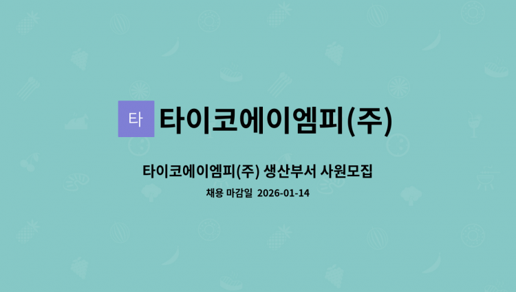 [경산고용센터 채용대행] 타이코에이엠피(주) 교대 생산직 사원모집 ■ 업체현황: 경산진량 직원 1,000명이상 규모 자동차,전기,전자부품인 컨넥터를 주생산하는 제조회사 ■ 업무 :조립공정 생산직 - 업무내용 : 자동화 조립공정 알람조치, 부품류 투입, 자주검사, 포장 등(경력자우대) - 남녀무관하게 지원가능 ■ 근로조건 : - 3조 3교대 중 Day(06:00-14:00) Mid(14:00-22:00) , 1개월 단위로 교대 (여자분) - 4조2교대근무( 3일 근무 3일 휴무, 주간 : 06시 ~ 18시, 야간 : 18시 ~ 06시, 1달단위교대근무), - 계약직(기간제)-1년 ■ 복리후생 외 : 통근버스,자녀학자금, 2식제공, 퇴직연금 ■ 통근버스 노선표 워크넷 참조 -수성구,동구,두류네거리,한독병원,7호광장,반월당,경산지역 등 운행 ■ 지원방법 : 워크넷 구직신청 필수→워크넷접속→회사명 타이코에이엠피(주) 검색→[워크넷입사지원]클릭 ■ 고용센터 서류접수→사업장전달→면접대상자 사업장에서 개별통보 예정 ■ 관련 문의처: 노동청 경산고용센터 취업지원팀 박은영 주무관(053-****-**** (*개인정보가 자동 블라인드 됩니다.))