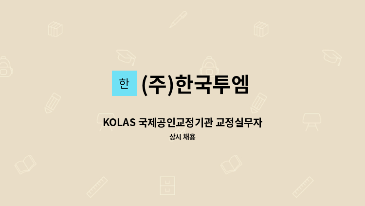 당사는 KOLAS 국제공인교정기관으로서 길이분야(선형치수, 각도, 형상, 복합형상, 기타 길이), 질량분야(질량, 힘, 토크, 압력, 경도, 부피, 밀도), 전기분야(직류, 저항, 용량 및 인덕턴스, 교류 및 교류전력, 기타 직류 및 저주파 측정) 온도분야(접촉식 온도, 비접촉식온도, 습도), 화학분야(가스분석) 등에 대한 교정서비스를 제공하고 있으며, 관련 기준장비를 제조 판매하는 기업으로서 당사와 함께 성장하며 장래를 보장 받고 싶은 유능한 교정실무 인력을 모집하고 있으니 많은 지원 바랍니다. * 우대 : 국제공인교정기관에서 교정실무경력 및 측정업무 경력자 - 한글 및 엑셀 활용 필수.