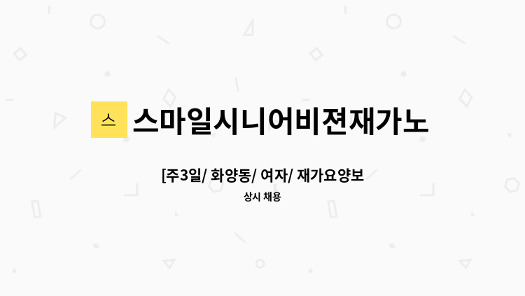 *센터명:스마일청연재가노인복지센터 *근무지: 서대문구 북가좌동 삼호아파트 *3등급, 독거 여자어르신(눈이 안보임), 일상생활지원, 음식조리도움 *주5일, 9시~12시 *시급 11,600원
