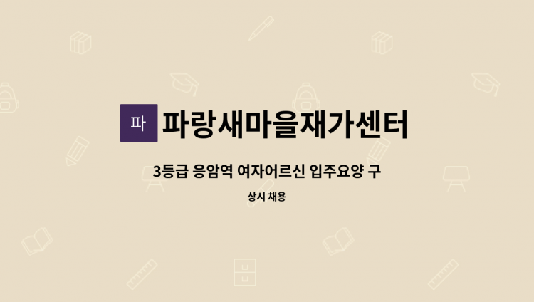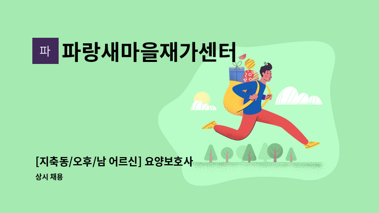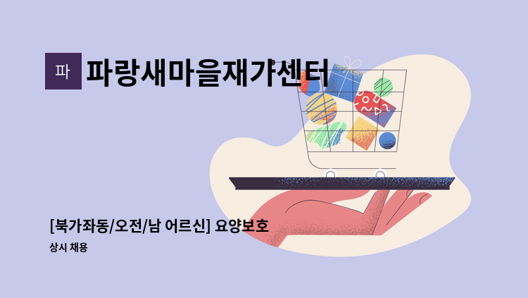 <파랑새마을재가> - 직종: 재가요양보호사 - 직무내용: 3등급 여자어르신 케어 - 근무시간: 09:00-12:00/ 주 5일 - 급여: 일급 11,600원 - 근무지: 서울시 은평구 갈현로 7길 16 5층