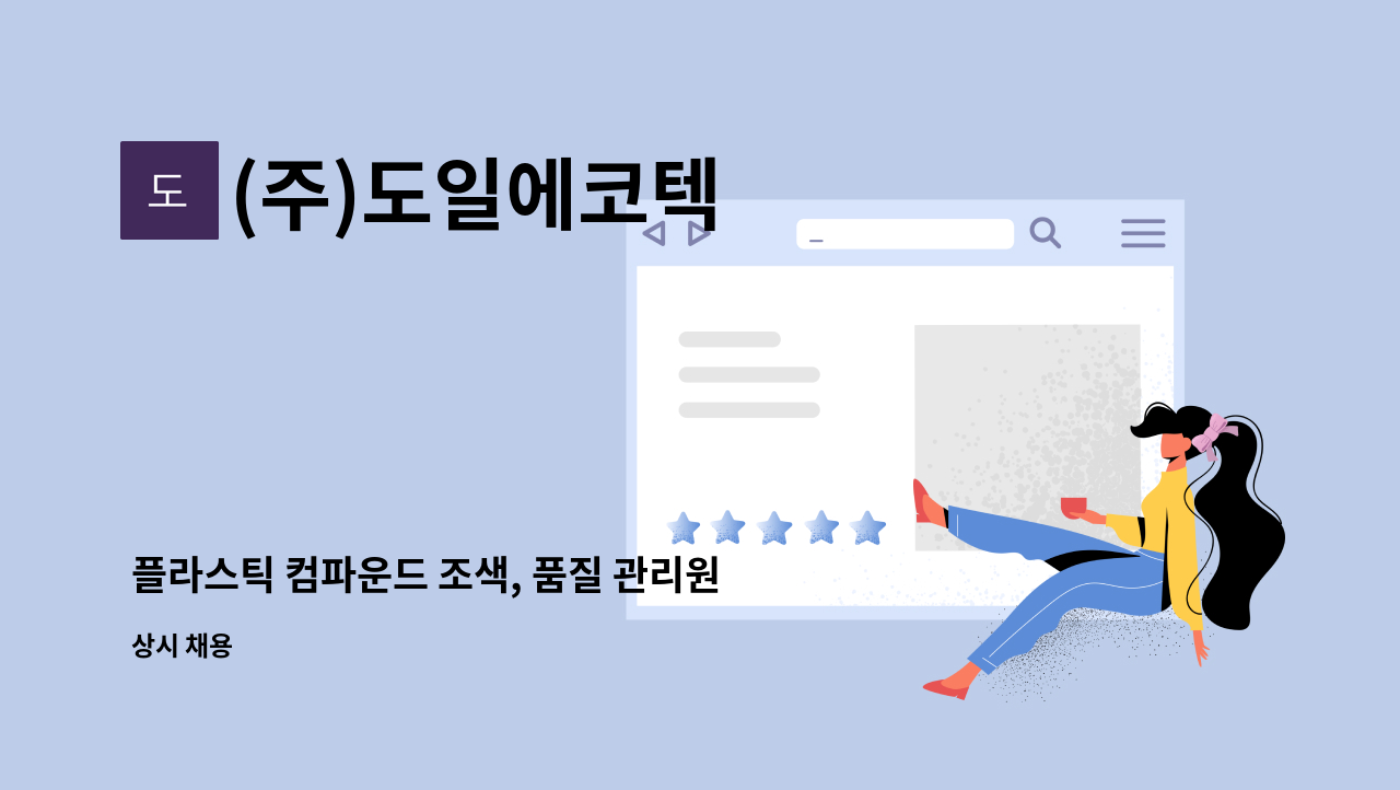1) 품질관리 업무 - 플라스틱 컴파운드 품질 측정 및 trend 체크 - 일일 품질 보고서 작성 2) 조색 업무 - 플라스틱 컴파운드 or 마스터배치 조색 업무 3) 인증 업무 - KS, 환경표지, 조달 등 인증 관련 업무
