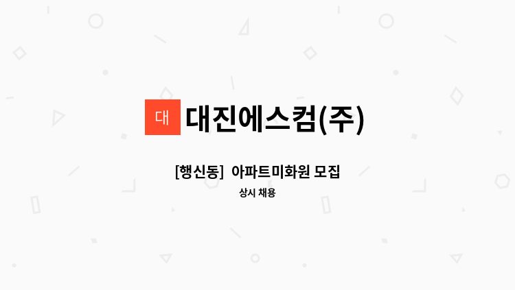 아파트 청소원 구인 /일산 임광진흥아파트 청소 /아파트 계단 청소 /월~금 09:00~16:00 토 9:00~12:00 휴게시간: 12:00~13:30 /월1,432,900원 문의 010-****-**** (*개인정보가 자동 블라인드 됩니다.)