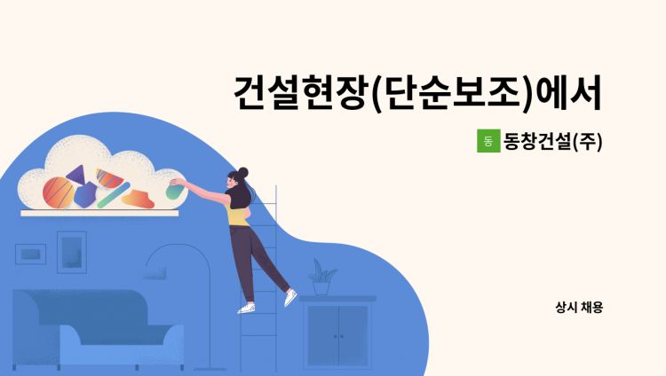 건설현장에서 근무하실 분을 모집합니다.( 현장보조)1명 시청 관급공사를 주로합니다.(상하수도공사) 화물차운전가능자 경력자 우대 급여 280만원이상 (협의가능) 이력서를 메일이나 팩스로 보내주시면 면접날짜 잡아서 연락드리겠습니다. 팩스: 055 - 314 - 1419 전화 : 055- 314 - 4151 이메일 : smk3586@ naver.com