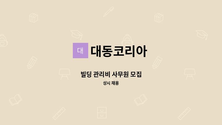 남원 (화장품원료생산) 지식산업센터 관리소장 채용 자격요건 : 고압전기 1,500Kw선임 소방안전관리자 선임 관리소장 가능자 관리면적 : 10,564.42㎡ (3,196평) 관리층수 : 지상1층 ~지상3층 조직도 : 관리소장1명, 관리기사1명, 미화원2명 운영관리, 민원업무, 미화관리, 시설물관리, 전반적인업무 등 월~금 오전 9시 ~ 오후18시 연봉 : 3,840만원