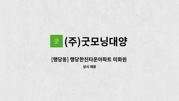- 양지마을 청구아파트 내부 미화원 모집 - 근무시간 : 주6일 (월~금) 09:00~16:00. (토) 09:00~12:00 - 월급 1,450,930원 * 전화문의 후 지원바랍니다(미화반장 010-****-**** (*개인정보가 자동 블라인드 됩니다.))