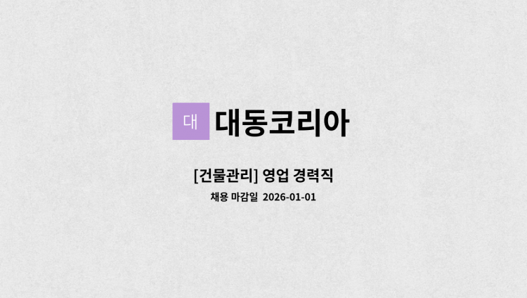 ※ 해당업무 : 순회 공용부 빌딩청소, 장비청소 ※ 교육내용 : 직무교육 ※ 연봉 : 신입 2,556만원 ~ 경력 3,000만원 (능력에 따라 급여 인상 및 차등 적용) ※ 식비 : 월10만원 (연간 120만원) ※ 자차운행 월 20만원 (연간 240만원) 별도지급, 회사차 제공 (업무용도 사용, 퇴근시 반납) ※ 근무조건 : 월~금 8시 ~ 17시, 토(격주) 8시 ~ 13시, 공휴일 휴일 ※ 복리후생 : 매월 간식제공, 년차휴가, 명절 선물 및 교통비, 퇴직연금, 월회식(식사), 경조사 ※ 팀분위기 : 분위기 좋음, 다들 열심히 합니다. ※ 수습기간 3개월 (1~3개월 수습기간 급여 적용 및 능력에 따라 축소될 수 있음) ※ 채용 우대사항 : 동종업종 근무자, 청소경력자, 꼼꼼하신분