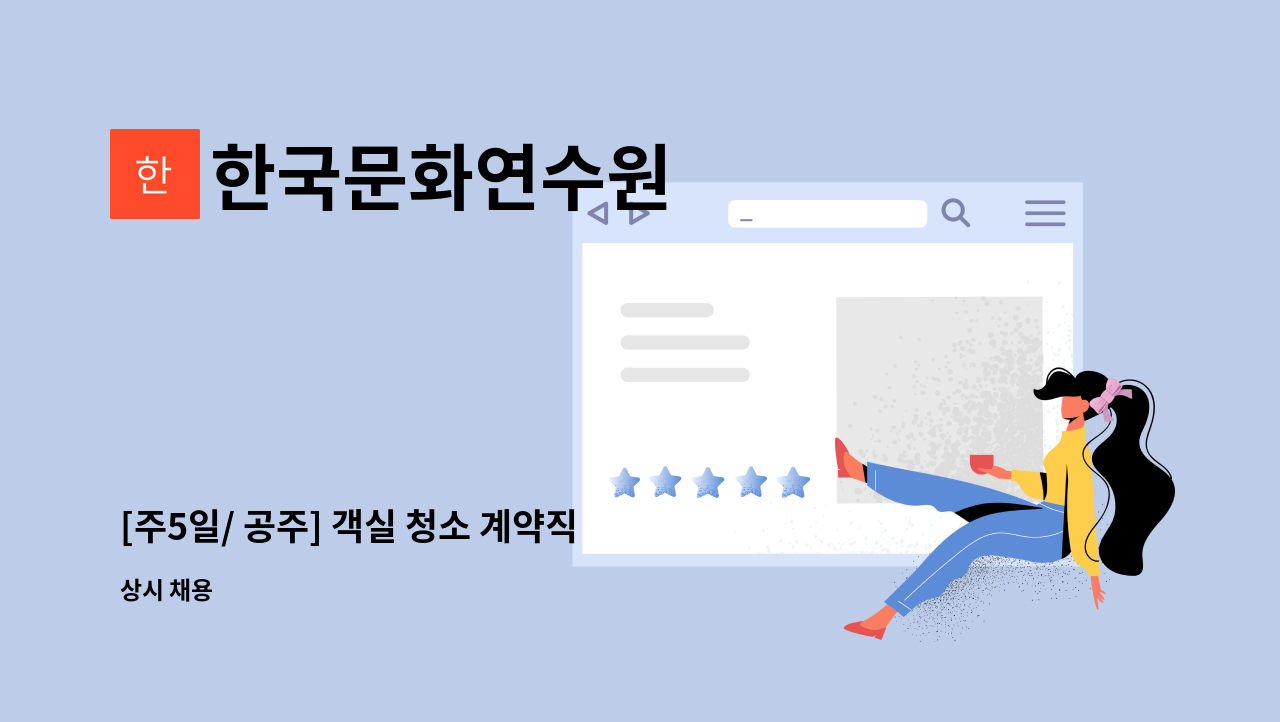 ▶연수원 객실동 청소1명 연수원 강의동 청소 1명 - 근무표에 의한 주5일 근무, 휴무 탄력운용 - 근로시간:09:00~18:00 - 임금:월 1,914,440원