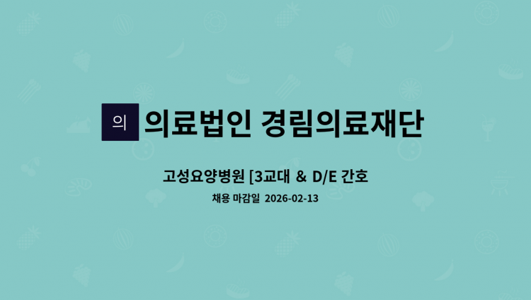 요양병원 원무행정 업무 및 구급차 운행 업무를 해주실 인재분을 모십니다. 1. 모집인원 : 1명 2. 업무 및 근무시간 -월~금(오전) 9시00분 ~ (오후) 5시30분 -토/일요일 및 공휴일 휴무 -연차 및 퇴직금 별도 지급 4. 연락처 : 010-****-**** (*개인정보가 자동 블라인드 됩니다.) (원무과장) / 055) 672-3100 5. 접수방법 : [email protected] 또는 방문접수 6. 홈페이지 : www.고성요양병원.com <<< 2주기 의료기관 평가인증 획득 2018.08~>>> 저희 고성요양병원은 2016년 10월에 개원하여 현재 허가병상 183병상, 2개병동이 운영되고 있으며, 2018년 4월 2주기 의료기관평가 인증을 마치고 통과하여 안정적으로 운영되고 있습니다. 위치: 고성IC 주변, 고성읍 입구 쪽에 위치하여 마산, 진주, 사천에서 40분거리, 통영 20분거리에 위치하고 있습니다.