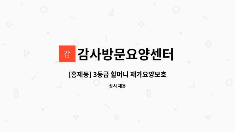 -홍제동 중앙하이츠아파트 거주 -3등급 와상 남자 어르신케어(배우자 거주), 인지 ,대화 가능, -전동침대 사용하지만 체위변경 가능하심. 수급자의 생활지원 제공,죽식만 드심 -기저귀 교체 케어, 수급자만 케어하면 되고 배우자는 신경 안 쓰셔도 됨(근방 큰 따님 왕래) -목욕 (휠체어 이동) 도움 *장기요양 적용 근로시간: 일 4시간(주 6일, 09:00~13:00) *장기요양급여: 시급 12,000원 *장기요양 근로시간 외: 비급여 혐의 가능 (월340만원 정도)