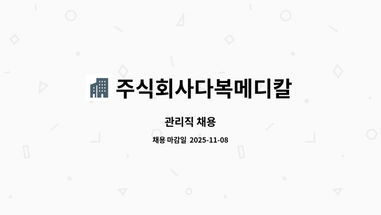 한국본사 (주)다복메디칼은 생명존중의 발전 이념을 가지고 한국 의료기기 제조 ,전문의약품 그리고 완벽한 유통경영시스템을 통해 세계시장을 개척하는데 노력하고 있습니다. 중국지사 위해금비유한회사는 (주)다복메디칼 중국 자회사로서 의료기기,의료소모품,의약품의 수출,수입업무,의료기기 제조를 주업으로 하고 있습니다. 다복메디칼 주소 : www.dabokmedical.com 다복몰 : www.dabokmall.com 다복샵: www.dabokmedicalshop.com/ 다복케어: www.dabokcare.com/ ▶ 모집분야 - 영업관리 (세금계산서, 발주 업무) - 회계/무역 관리 ▶ 자격요건 - 대졸(2~3년)이상 - 경릭 5년이상 ▶ 근무조건 - 근무형태: 수습3개월 후 상용직 전환검토 - 근무요일: 주 5일 - 근무시간: 09:00 ~ 18:00 - 급여: 2500~5000만원 (면접시 협의) - 4대보험 ▶ 담당업무 - 회계실무 - 쇼핑몰 관리 - 해외 수입·수출 무역관리 - 세금계산서 발급 및 발주관리 ▶ 우대사항 - 해당직무 근무경험, 회계 관련 자격증소유자, 회계, 무역 업무 다수 경험자 ▶ 지원안내 - 워크넷 이력서 지원 회사와 함께 발전해 나아갈 열정있는 분들 적극 지원 부탁드립니다:)