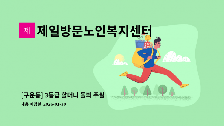 ▶ 4등급 할머니 케어 ▶ 가사지원 요양서비스 ▶ 주6일근무 08:00~11:00 ▶ RFID 태그 찍을 수 있는 휴대폰 보유자/인근 거주자 우대 ▶ 전화 문의 후 방문 : 010-****-**** (*개인정보가 자동 블라인드 됩니다.) ※ 실제 서비스 제공기간에 따라 임금을 계산하여 지급하는 형태로 채용 시 근로자마다 주 소정근로시간이나 임금, 근무(예정)지 등에 차이가 있을 수 있음.