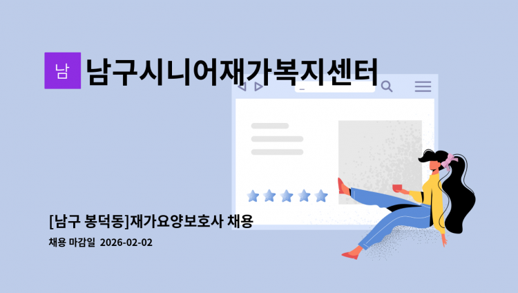 [수성구 만촌동] 재가요양보호사 채용 대상자 : 4등급 할머니 근무지 : 수성구 만촌동 이마트 인근 근무내용 : 어르신케어 및 일상생활 서비스지원 근무시간 : 오전 09:00 ~ 12:00 (주6일) 시급 : 11,600원 ※지원문의 : 053-****-**** (*개인정보가 자동 블라인드 됩니다.)/ 010-****-**** (*개인정보가 자동 블라인드 됩니다.)