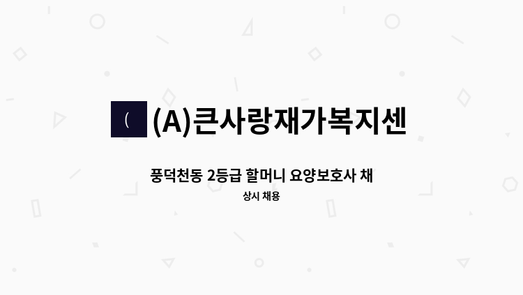 - 4등급 할머님 재가대상자케어 - 간병일상생활지원서비스(정서지원, 가사지원) - 주5일 : 12:00 ~ 15:00(시간협의) ※실제서비스 제공기간에 따라 임금을 계산하여 지급하는 형태로 채용시근로자마다 주 소정근로시간이나 임금, 근무(예정)지 등에 차이가 있을 수 있음