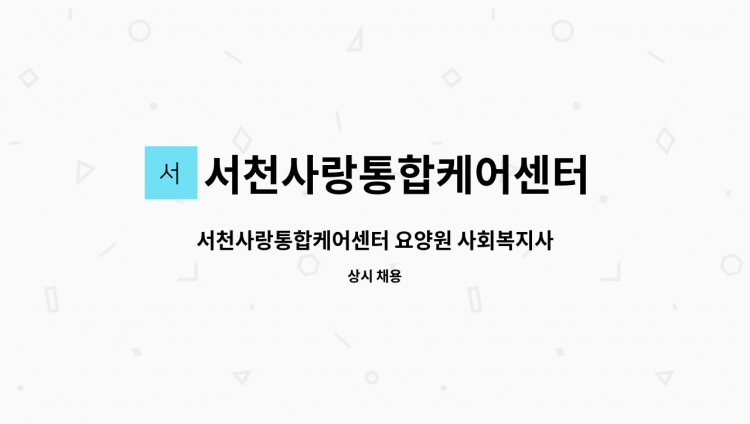 □ 채용분야 및 인원 - 사회복지사 1명 □ 자격요건 - 사회복지사 자격증 소지자 □ 우대사항 - 운전면허증 소지자 우대 - 사회복지시설 근무 경력자 우대 - 컴퓨터 활용가능자 우대 - 치매교육 이수자 우대(요양보호사) - 취업지원프로그램 이수자 또는 이수면제자 우대 □ 제출서류 - 이력서 1부(하단 ‘붙임 1’ 참고) - 자격증 사본 1부 □ 지원기간 및 전형절차 - 지원기간 : 2022.06.28(화) ~ 충원 시 - 전형절차 : 서류전형 > 면접전형 > 합격자 발표 > 입사 ※ 입사 2022년 07월 중(모집분야 별로 상이함) □ 근무조건 - 근무회사 : 서천사랑통합케어센터 요양원 - 근 무 지 : 충청남도 서천군 대백제로 1042-7 - 고용형태 : 정규직 - 보 수 : 당사 내규 □ 접수 - 방 법 : 방문접수 - 접수일시 : 월-토 오전9시 ~ 오후5시30분까지 접수 가능 - 접수장소 : 충청남도 서천군 대백제로 1042-7, 서천사랑통합케어센터 요양원 - 문 의 처 : 041)951-8058 / FAX : 041)951-8887 □ 기타 - 입사지원서의 내용이 사실과 다른 경우 합격이 취소됩니다. - 합격결정 후에도 신원조회 및 건강진단서 등 부적합한 결격사유가 있을 경우 합격이 취소될 수 있습니다. - 면접일정은 서류전형 합격자에 한하여 개별적으로 안내해 드립니다. - 제출하신 서류는 『채용절차의 공정화에 관한 법률 제11조(채용서류의 반환 등)』에 의거 최종 합격자를 제외한 구직자는 제출일로부터 30일 이내에 반환 요청할 수 있고, 불합격자의 제출서류 일체는 공개채용 종료 후 『개인정보 보호법』에 따라 파기합니다.
