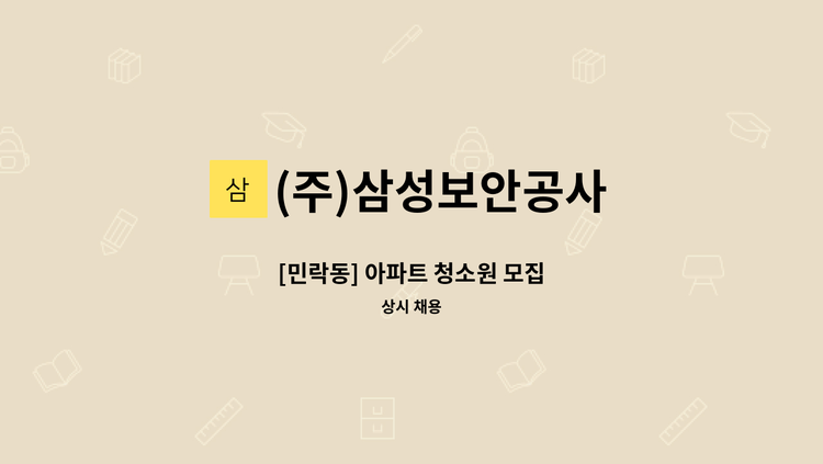 - 아파트 단지 내 청소 * 담당자와 통화 후 면접시간, 장소 안내 받으시길 바랍니다. * 담당자: 사상구청 일자리센터 051-****-**** (*개인정보가 자동 블라인드 됩니다.)