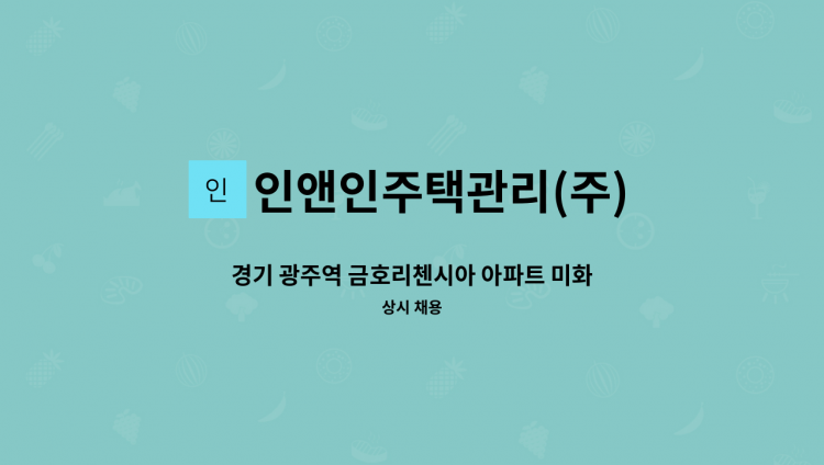 *근면성실한 시설관리원 모집합니다.* 1. 모집인원: 1명 2. 근무시간: 09:00~16:00(휴게 1시간 15분 포함), 주5일근무 3. 업무내용: 공용부분 청소(복도, 계단, 승강기내부, 화장실 등) 5. 월급여: 1,373,270원(연차, 퇴직급 별도지급)/식대5만원 별도지급