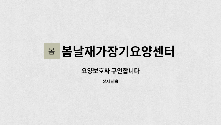 [봄날재가장기요양센터] 주5일 / 재가요양보호사 구인 -5등급 85세 독거 여자어르신 -치매교육이수 필수 -직무: 말벗, 산책, 일상생활케어 -근무시간: 주5일 (12시~15시) 하루3시간 -근무지 : 의왕시 오전동 대명구름채아파트 -급여: 시급 12,000원