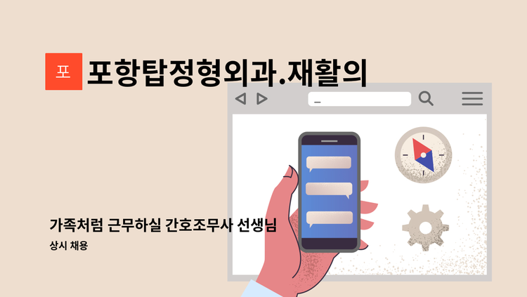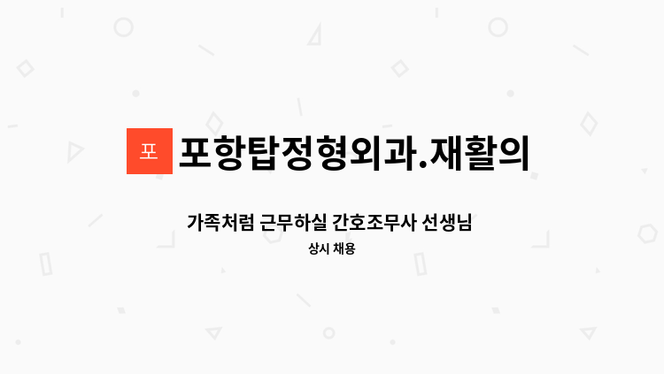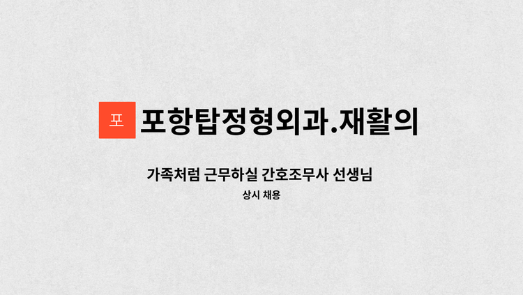*모집사유:결원보충으로 도수치료사 1명 모집(현재 물리치료실 4명, 도수치료실 4명 근무 중) *면접시 연봉 협의 가능-인센티브 적용 *퇴직연금 가입, 보수교육비 지원. *재활의학과,정형외과 전문의 2인 운영으로 19년 open 하였으며 깨끗한 시설 및 직원들간의 가족같은 분위기의 근무환경이 조성되어 근무시 자부심을 느낄수 있으니 많은 지원 바랍니다.