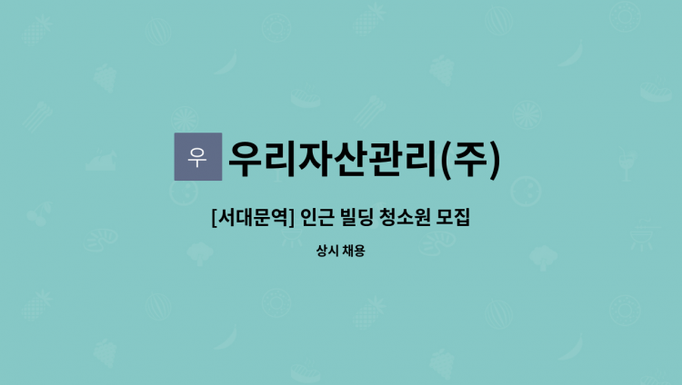 - 하남감일백제로 아파트 미화원 모집 - 근무시간 :평일 09:00~16:00 / 토요일 09:00~12:00 - 월급여 150만원