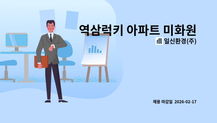 안산 신길휴먼시아7단지 아파트 미화원(반장) * 9:00 ~ 15:40 (휴게 1.5시간), 토 09:00~11:00, 주6일 * 월 1,393,550원 * 신주없음 * 문의 031-****-**** (*개인정보가 자동 블라인드 됩니다.) 또는 팩스 이력서 전달(031-****-**** (*개인정보가 자동 블라인드 됩니다.))