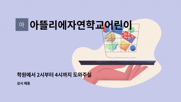 안녕하세요. 수지 동천동에 위치한 아뜰리에자연학교&키즈스쿨입니다. 즐거운 분위기에서 함께 근무해주실 부담임교사를 모십니다. 1. 채용현황 부담임교사(08:30~17:30) ∎ 보육교사 자격증 소지자, 담임을 도와 보조업무 ∎ 장기미이수자교육해당자는 이수 완료자 ∎ 업무 부담이 크지 않음 2. 급여 및 우대조건 ∎ 부담임 : 영유아보육법 누리보조 기본급 + 각종 수당 ∎ 주 5일 근무제 ∎ 여름방학1주일, 겨울방학1주일/ 그 밖의 개별비타민휴가 추가제공(정담임) 3. 채용절차와 방법 ∎ 전형방법 : 1차 서류전형/ 2차 면접 ∎ 서류접수방법 : 이력서 & 자기소개서 이메일 접수 ∎ 이메일 주소 : [email protected] 메일 제목에 응시분야 기재 ∎ 연락처 031-****-**** (*개인정보가 자동 블라인드 됩니다.)(대표번호) 4. 아뜰리에 찾아오시는 길 ▶ 경기도 용인시 수지구 동천로 297번길 11