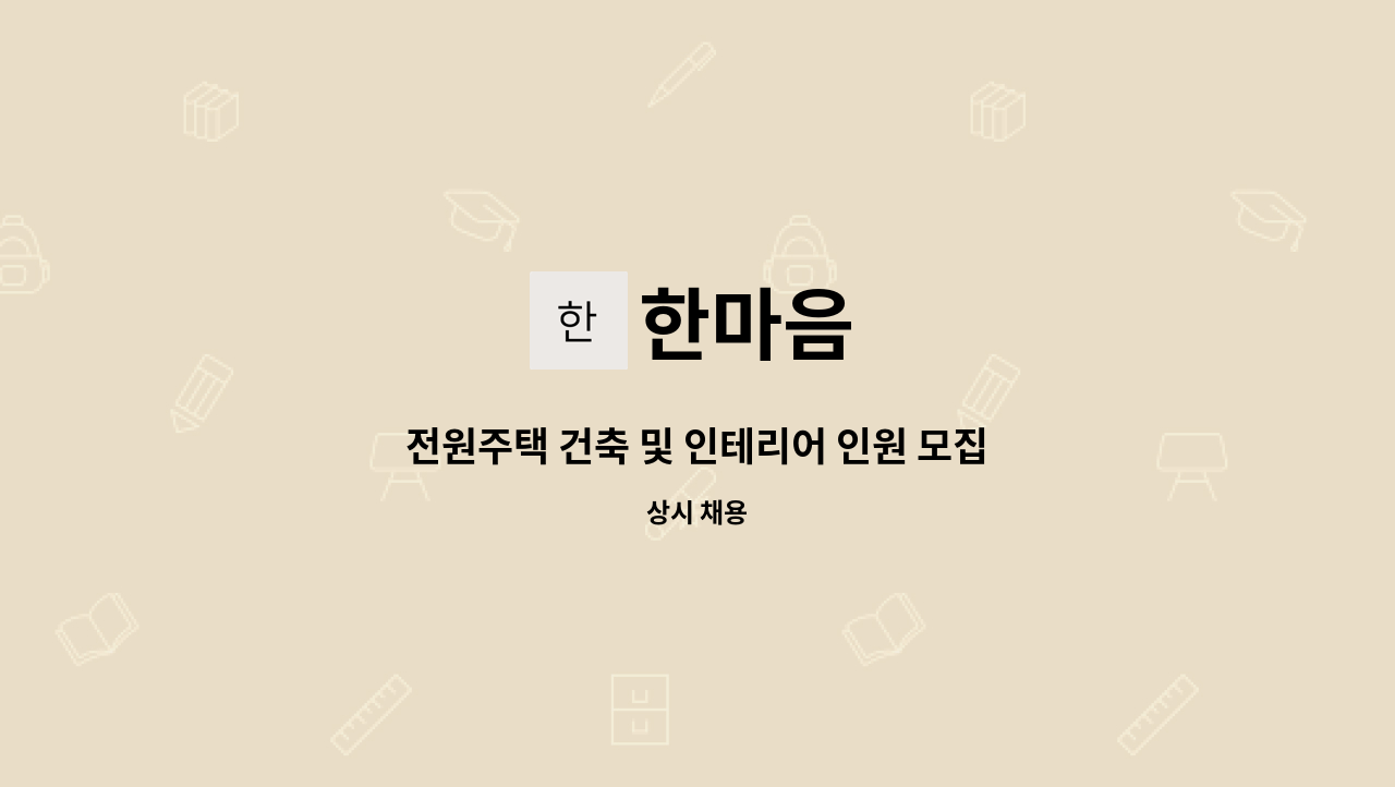안녕하세요? 한아름입니다. 인원모집을 합니다. (모집인원 1명) 인테리어, 이동식주택, 전원주택 을 짓는 회사 입니다. 인테리어 디자인 및 공무직 경험을 하신 경력직 지원 환영하고 신입도 환영합니다. 경력 및 신입 분들 임금 측정이 달라 안내 못하는점 양해바랍니다. 좋은인연 만들었으면 좋겠습니다. 좋은 하루 되세요