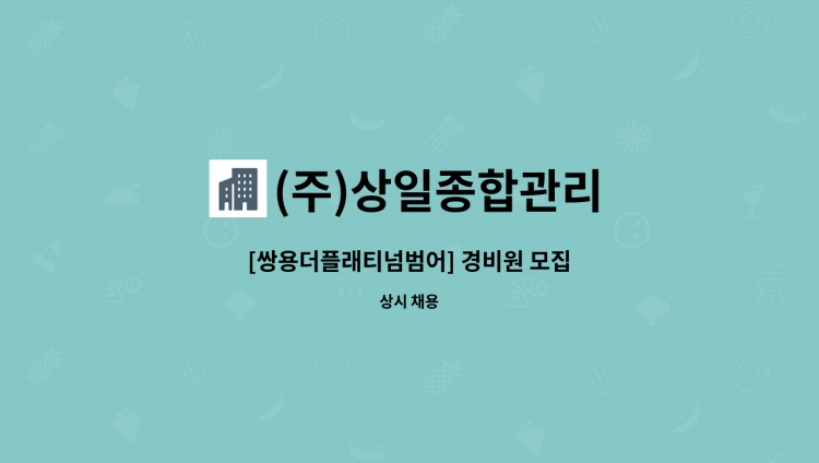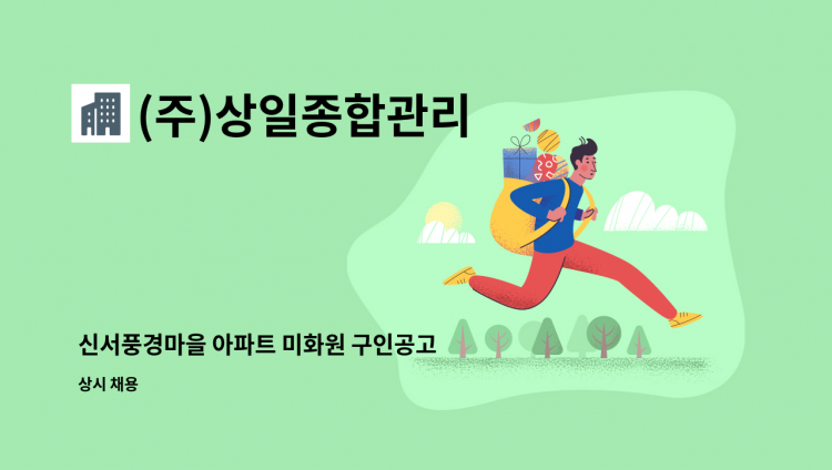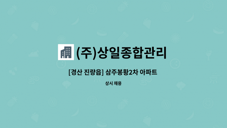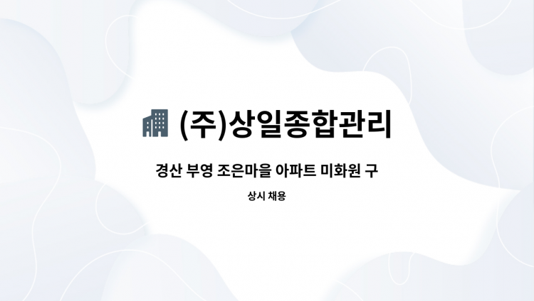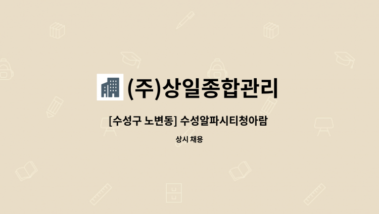 아파트 외곽 청소원 모집 - 수성알파시티청아람 아파트(대구월드컵경기장 인근) - 평일 : 09시 ~ 16시 (휴게1시간) - 토요일 : 09시 ~ 12시 - 급여 : 1,652,400원