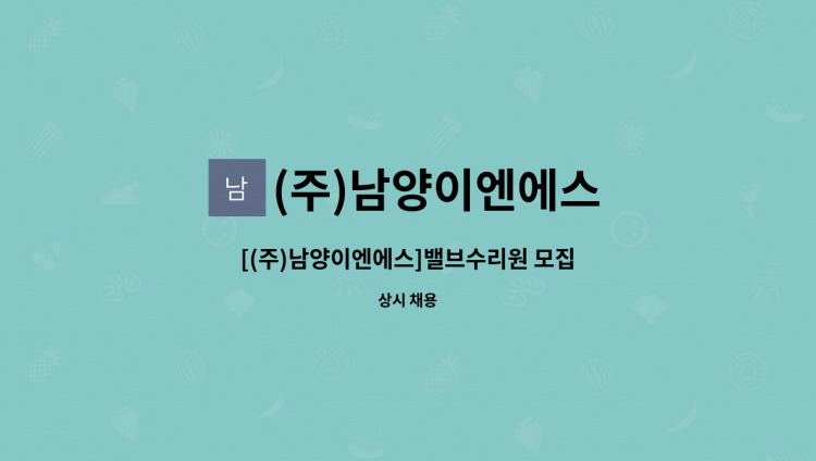 ㈜남양이엔에스는 2005년부터 포스코 광양제철소 전기정비 협력작업을 수행하고 있습니다. 원료, 제선, 제강, 압연, 후판 등 제철소 전공장의 전기정비를 담당합니다. 주요업무는 전기·계장정비, 제어밸브수리, 자동화시스템정비, 광통신정비 입니다. 광양제철소 착공과 함께 30년이 넘는 세월동안 전기정비 업무를 수행하며 축척해 온 기술력은 글로벌 No.1 전기계장 기술을 자랑하고 있습니다. 품질, 안전, 혁신, 사회공헌 등 대내외 다양한 수상경력을 보유하고 있으며 2017년 광양제철소 최우수 협력사 선정된 바 있으며 매년 50여개 광양제철 협력사 중 우수협력사로 선정되어 여러 인센티브를 제공하고 있습니다. ○ 지원방법 - 채용대행 사업장으로 반드시 구직신청 후 지원바람 - 접수방법: 이메일([email protected]) 접수 - 지원서류: 이력서, 자기소개서(하단에 자사양식) - 메일접수시 제목에 '남양이엔에스-전기정비직' 명기바람 ○ 미니매칭데이 - 일시: 2022.10.27 (목) 15:00~ - 장소: 광양락희호텔 (광양시 항만9로 97) - 사전 이메일 접수를 권장하나 행사 당일 필요서류 지참 방문 시 면접 가능