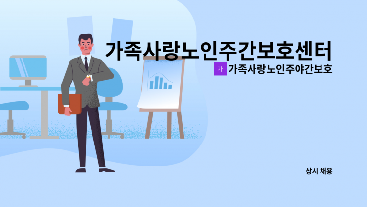 가족사랑노인주야간보호센터에서 함께 일하실 요양보호사 선생님 모집합니다. - 센터 내 여자 어르신 세신서비스(주 1회) 및 케어 - 송영 서비스 - 기타 업무 주 업무는 어르신 케어 입니다. 저희 센터는 주 1회 어르신들께 세신(목욕)서비스를 제공하고 있습니다. 궁금하신 사항이 있으시면 센터로 연락 바랍니다. 많은 지원 바랍니다. 감사합니다.