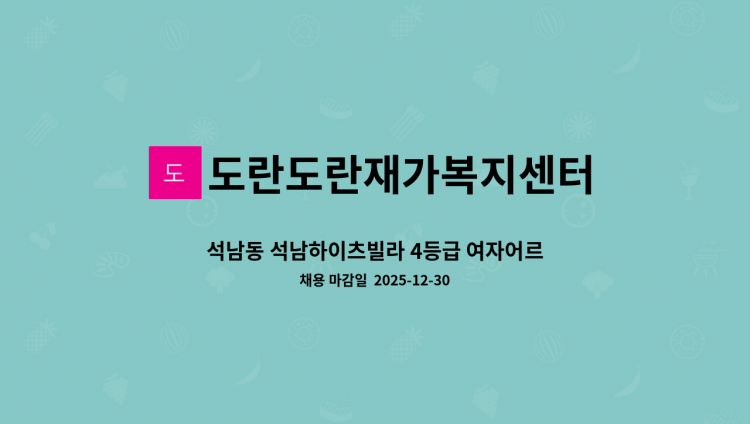 인천 서구 연희동 원룸에 혼자 사시는 여자 어르신입니다. 입주할 수 있는 입주 요양보호사 모집합니다. 월 4회 휴무합니다. ( 휴무는 주중만 가능합니다. ) 주말 휴무 안됩니다. 월 300만원입니다. 2등급이라 하루 3,000원 중증수당 지급합니다. 교포 선생님도 환영합니다. 입주 원하시는 요양보호사님 지원해 주세요~~~