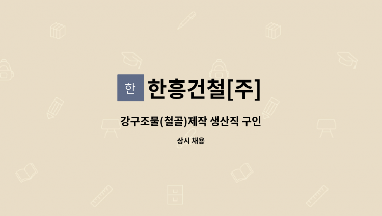 건설현장 시공관리 경력자 우대 테크라 사용자 우대 강구조물 건축설계 경험자 우대 - 면접시 협의된 근로의 장소, 업무의 범위, 근로시간 등 근로조건은 근로개시전 근로계약서 명기바랍니다