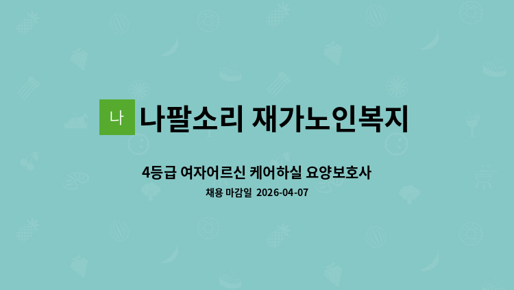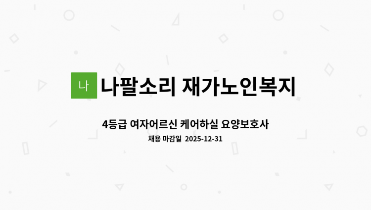 4등급 여자 어르신을 케어할 요양 보호사님을 구합니다. 서비스 제공 시간 : 14:00 ~ 17:00 (주5회) 기타 문의사항은 아래 번호로 연락 주시면 감사하겠습니다. 010-****-**** (*개인정보가 자동 블라인드 됩니다.)