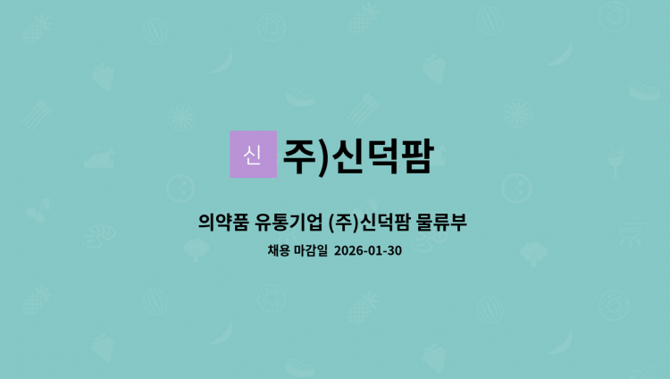 (주)신덕팜은 종업원 70인 이상이 근무 중인 의약품 유통기업입니다. 구매관리부 직원 한 분을 모집합니다. * 담당업무 : 특정 거래처에 의약품 납품, 문서작성 등