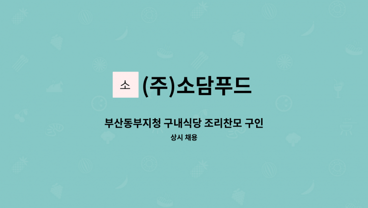 (주)소담푸드 구내식당 영양사 채용 - 근무지;장림 산업체 구내식당 - 근무시간:09:00~16:00(주5일) 휴게시간:14:00~15:00 - 월급: 180만원 - 경력 2년이상 필수