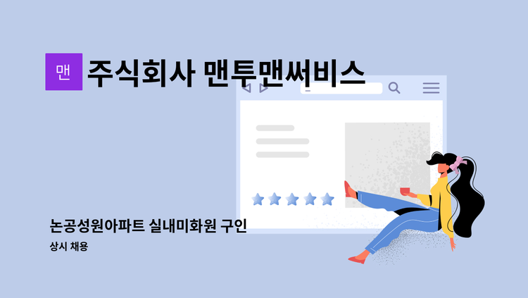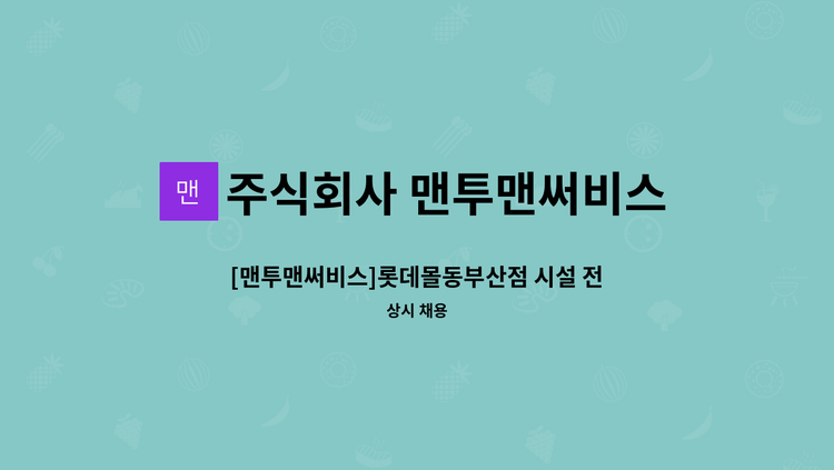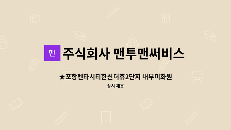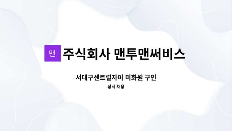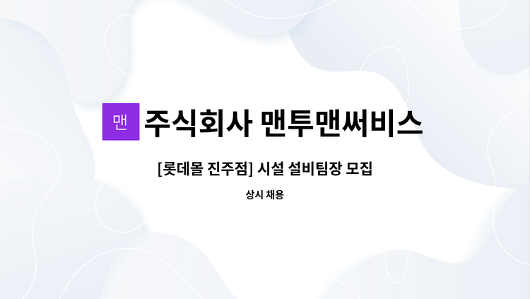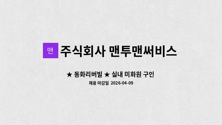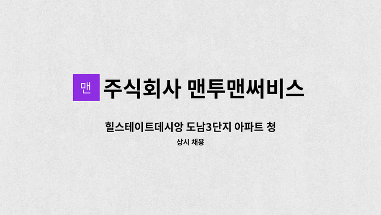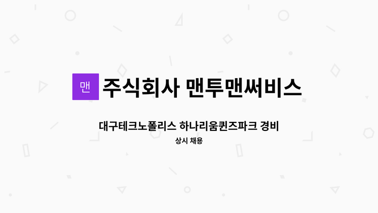 ■(주)맨투맨써비스 본사 (아파트)영업관리사원 모집■ (주)맨투맨써비스는 인력 아웃소싱 전문 업체로서 금번 사세 확장에 맞추어 아파트 관리업무를 진행할 경력직 사원을 모집하오니 많은 지원 바랍니다. * 근무지 : 대구시 서구 서대구로 30 (내당동, 맨투맨빌딩)4층 -지원자격- 가. 학력, 연령, 성별 무관 나. 아파트 관리 경력자 (필수) 다. 자가차량 소유자인 자 우대 -업무내용- 가. 기존 계약 아파트 본사 업무지원 나. 신규 아파트 공개입찰 및 아파트 계약 미팅 다. 입찰서류 작성 (기본 사무 업무 및 공문서 작성) 라. 기타 아파트 관리 업무 등 -근무조건- 가. 근무시간 : 09시 ~ 18시 까지 나. 주5일 근무, 국공휴일 휴무 다. 급여 : 경력에 따라 차등 지급 -복리후생- 4대보험, 퇴직연금, 연차휴무, 하계휴가, 식대비 지원, 통신비 지원, 유류대 지원 등 -제출서류- 가. 이력서 (사진첨부, 희망연봉 기재 필수) 나. 경력소개서 또는 자기소개서 -제출처- 이메일 제출 : [email protected] / 053-****-**** (*개인정보가 자동 블라인드 됩니다.) / 010-****-**** (*개인정보가 자동 블라인드 됩니다.) (이메일 제출) * 관심 있는 분들의 많은 지원 부탁드립니다.