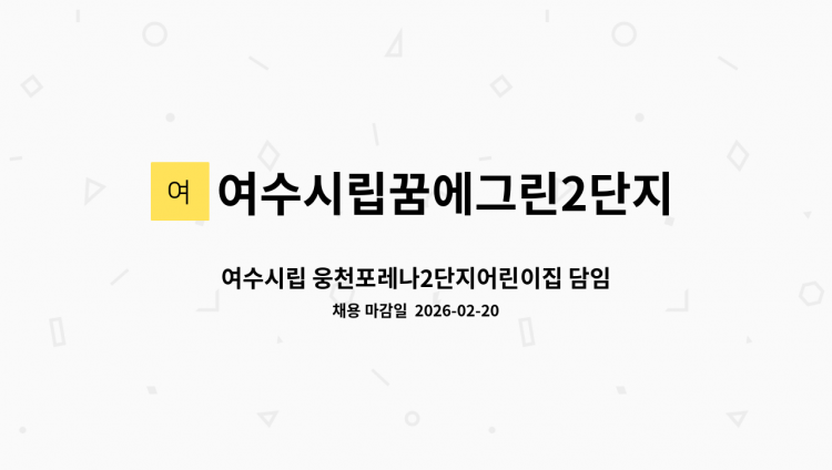 여수 꿈에그린2단지어린이집 담임교사 구합니다. * 접수방법 : 이메일 - [email protected] * 서 류 : 이력서 및 자기소개서 (채용 후 추가 제출 서류 - 공무원채용신체검사, 등본, 보건증, 인사기록카드, 자격증 사본, 개인정보동의서, 성범죄 및 아동학대 조회서) * 근무조건 : 계약직 ( 23년 2월 ~ 24년 2월 ) * 근무시간 : 주 5일 오전 8시 30분~ 오후 5시 30분(휴게시간 1시간 포함) * 당직근무시 오전 7시 30분 ~ 오후 4시 30분 * 급여조건 : 보육사업 내용에 따라 호봉 지급, 4대보험 및 퇴직금지급(1년이상 근무시) * 서류접수 후 면접 대상자는 개별연락 드립니다. * 문의전화 : 692-2456