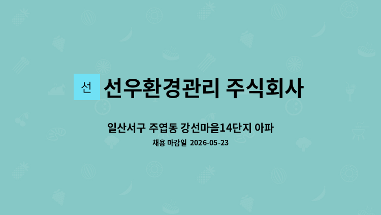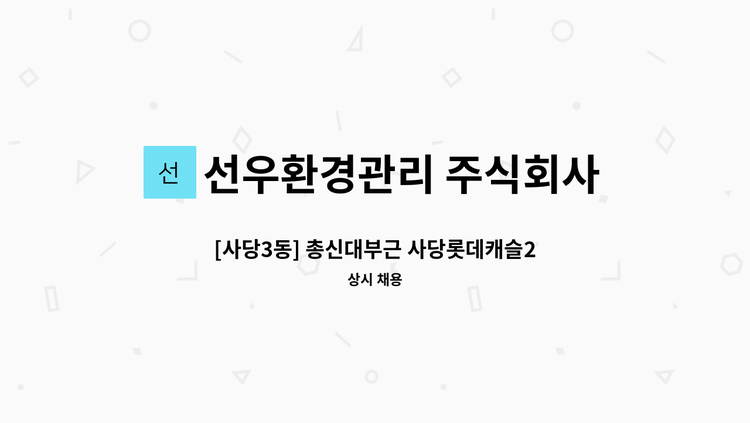 - 송도 더샾센트럴시티 아파트(지식정보단지역4번출구 700m) - 월 1,630,310원 - 주6일 평일08:00-15:00, 토 08:00-11:00 - 지원문의) 미화팀장 010-****-**** (*개인정보가 자동 블라인드 됩니다.) * 명절, 달력 빨간날 휴무입니다