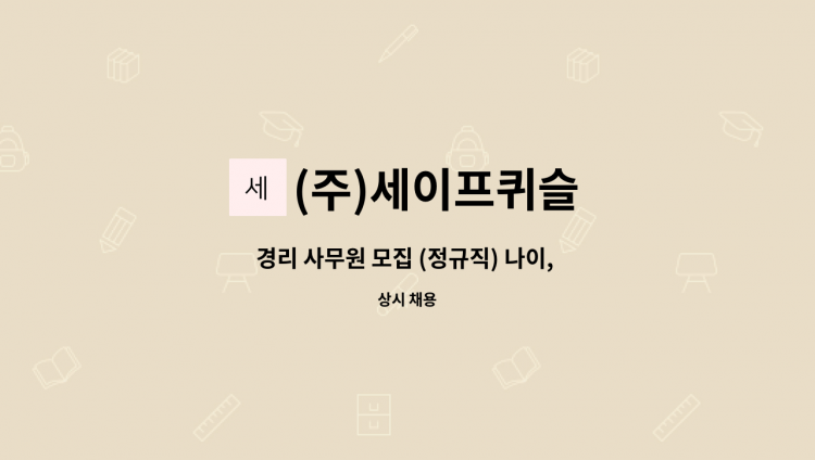 (주)세이프퀴슬은 2009년에 설립된 가스용품 전문 제조기업으로 가스타이머콕 및 전자식 가스누출확인 퓨즈콕을 개발하여 생산, 판매, 유통하고 있습니다. ★직무내용★ - 가스용품 개발, 인증, 품질업무 ★필수사항★ - 품질, 인증 경력 3년 이상 필수 -오토 캐드 사용 필수 ★우대사항★ - 기계 전공자 우대 - 가스 관련 자격증 소지자 우대 - R&D 수행경험자 우대 (최우선 우대, 자기소개서에 수행내역 자세히 적어주세요) - 제조업체 근무 경험자 우대 - 청년내일채움공제 신청가능합니다. (요청시) ★참고사항★ - 수습기간 3개월 있습니다. (단, 경력인정자는 업무능력평가후 수습기간 단축가능합니다.)